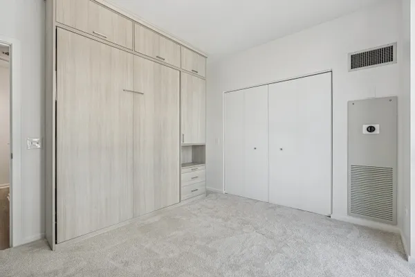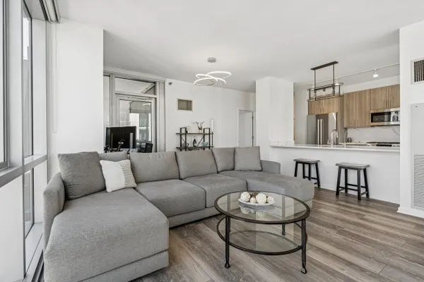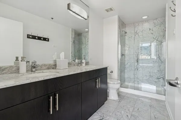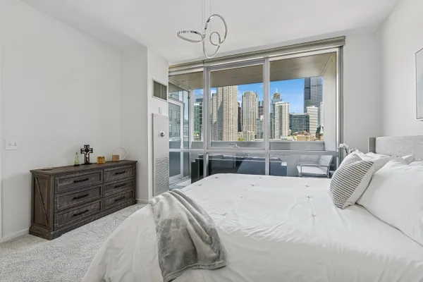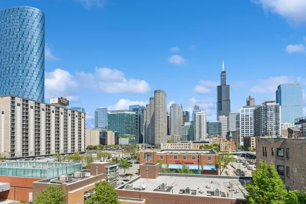 Beautifully RENOVATED CORNER unit in one of the West Loop's premier buildings, The Emerald! This spacious 2 bed / 2 bath home showcases breathtaking skyline views, a sought-after open layout with a split floor plan, soaring ceilings, wrap-around floor-to-ceiling windows, automated shades throughout, and two private balconies. One of the two private balconies is conveniently located just off the kitchen-perfect for grilling. The chef's kitchen is a showstopper with new custom cabinetry and hardware, a premium Bosch stainless steel appliance package, quartz countertops and backsplash, an Elkay stainless sink with Grohe faucet and filtered water tap, and a breakfast bar. Large primary suite includes a custom walk-in closet and a spa-like en-suite bathroom with dual vanity, sleek marble finishes, and a glass-enclosed walk-in shower. The second bedroom, conveniently located next to the second full bath, features a custom-built queen wall bed system with extra storage-a perfect, flexible space for guests or a home office. Additional updates include new luxury vinyl plank flooring, ultra-plush carpet in bedrooms, LED lighting throughout, new Kohler toilets, and custom bathroom hardware. The laundry area features a new LG ThinQ washer/dryer. Energy-efficient and move-in ready, this unit is located in a LEED-certified, full-amenity building with 24/7 door staff, a fitness center, resident lounges, and more. HOA includes everything but electricity. Live in the heart of the vibrant West Loop, steps from Randolph Street's Restaurant Row, Fulton Market, Whole Foods, public transit, and top-rated Skinner School District. Heated garage parking available for $30,000.