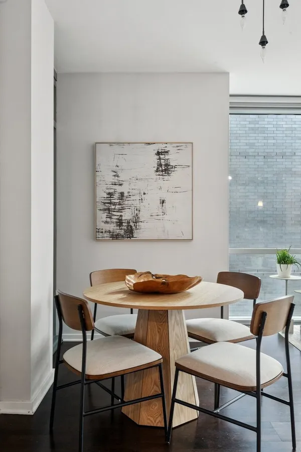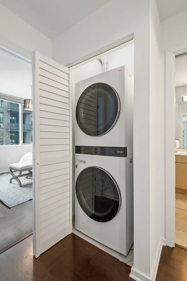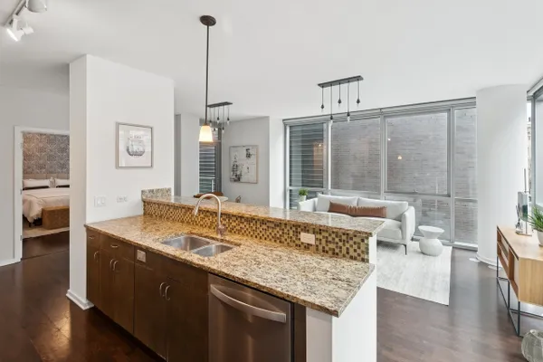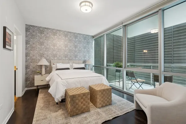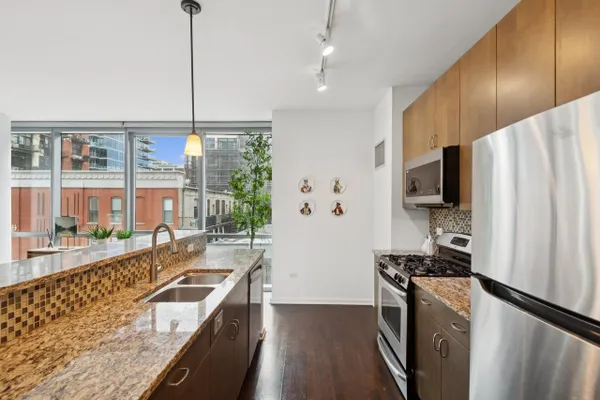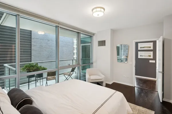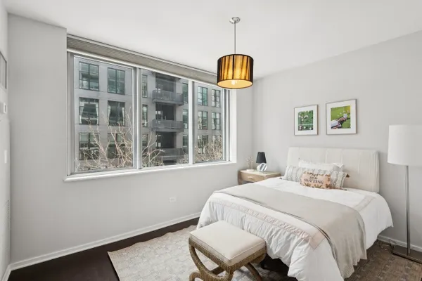 Experience elevated city living in the heart of the West Loop! Sunny southwest corner 2BR/2BA at The Emerald featuring floor-to-ceiling windows, an open-concept layout, and hardwood floors throughout. The spacious kitchen offers stainless steel appliances, granite countertops, ample cabinetry, and breakfast bar seating-perfect for everyday living and entertaining. Split-bedroom floor plan provides excellent privacy, with a primary suite featuring a walk-in closet and en-suite bath with dual vanity and walk-in shower. Second bedroom is ideal for guests or a home office. Enjoy an oversized private balcony, in-unit laundry, and additional storage. Full-amenity building with 24-hour door staff, fitness center, and workspace. Storage cage included; deeded garage parking available for $35,000.