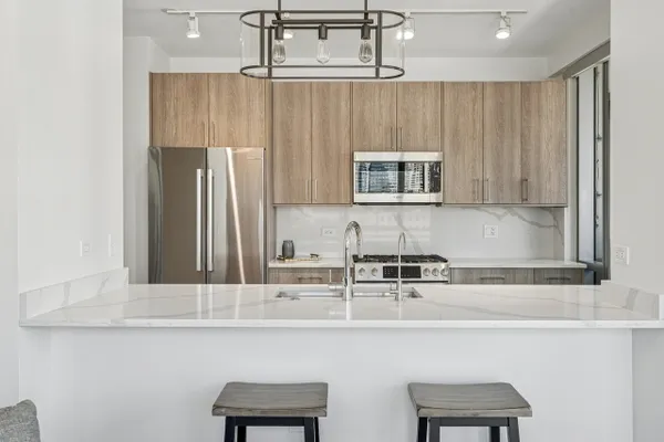 Beautifully RENOVATED CORNER unit in one of the West Loop's premier buildings, The Emerald! This spacious 2 bed / 2 bath home showcases breathtaking skyline views, a sought-after open layout with a split floor plan, soaring ceilings, wrap-around floor-to-ceiling windows, automated shades throughout, and two private balconies. One of the two private balconies is conveniently located just off the kitchen-perfect for grilling. The chef's kitchen is a showstopper with new custom cabinetry and hardware, a premium Bosch stainless steel appliance package, quartz countertops and backsplash, an Elkay stainless sink with Grohe faucet and filtered water tap, and a breakfast bar. Large primary suite includes a custom walk-in closet and a spa-like en-suite bathroom with dual vanity, sleek marble finishes, and a glass-enclosed walk-in shower. The second bedroom, conveniently located next to the second full bath, features a custom-built queen wall bed system with extra storage-a perfect, flexible space for guests or a home office. Additional updates include new luxury vinyl plank flooring, ultra-plush carpet in bedrooms, LED lighting throughout, new Kohler toilets, and custom bathroom hardware. The laundry area features a new LG ThinQ washer/dryer. Energy-efficient and move-in ready, this unit is located in a LEED-certified, full-amenity building with 24/7 door staff, a fitness center, resident lounges, and more. HOA includes everything but electricity. Live in the heart of the vibrant West Loop, steps from Randolph Street's Restaurant Row, Fulton Market, Whole Foods, public transit, and top-rated Skinner School District. Heated garage parking available for $35,000.