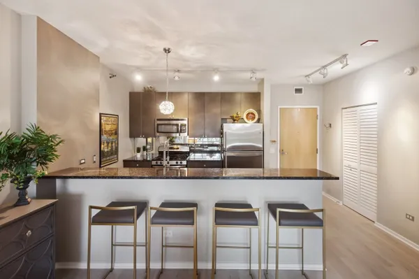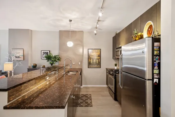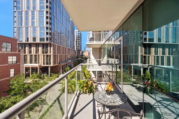 Amazing opportunity for stunning home in PRIME West Loop's highly sought after Emerald! Sleek yet warm and inviting with floor to ceiling walls of glass facing West and 9' ceilings add great wow factor from the moment you walk in. New wide plank light hardwood floors throughout entire unit elevate the space perfectly. Modern high-end open kitchen w/ full height custom flat panel cabinets, stainless steel appliances & granite countertops w/breakfast bar opens up into ideal open concept floor plan. Oversized balcony off of living/dining room extends your living space and offers great indoor/outdoor spaces to relax and entertain. Bedroom has floor to ceiling windows, professionally built out closets, and ample space for a king size bed. Spacious bathroom w/separate shower & soaking tub, great storage, & in unit w/d. Additional updates include newer neutral paint throughout and upgraded light fixtures adding the perfect pops of glam throughout. 1 deeded parking spot in attached heated garage-30K. Full service modern building w/doorman, fitness center, party rooms, business center, etc. Dream location in heart of the West Loop!